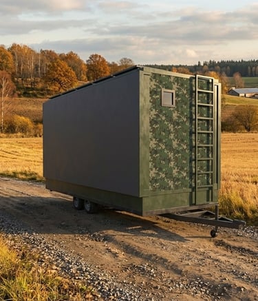 Kompaktowy dom modułowy inspirowany militarnym stylem.